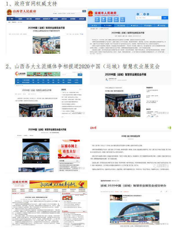 2021中國(運城)智慧農業展會作為山西最專業的農業展,受到了多家權威媒體的爭相報道,包括新華網、人民網、搜狐網、騰訊網、今日頭條、山西日報、山西新聞網、黃河新聞網、運城日報、運城電視 臺、火爆農資網、北方農資、長江蔬菜等200余家。被山西省人民政府, 運城市人民政府等多家政府官網全頁轉載。