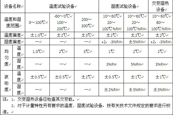 高低溫系列試驗箱出廠前廠家都會自帶一份內部檢測報告,如內部檢測報告不能滿足用戶要求時,可請計量院上門對設備進行檢測并出具檢測報告(需付費)。計量院會對高低溫系列試驗箱的溫度偏差、溫度均勻度、溫度波動度,相對濕度偏差、相對濕度均勻度、相對濕度波動度進行計量,其技術要求如下: