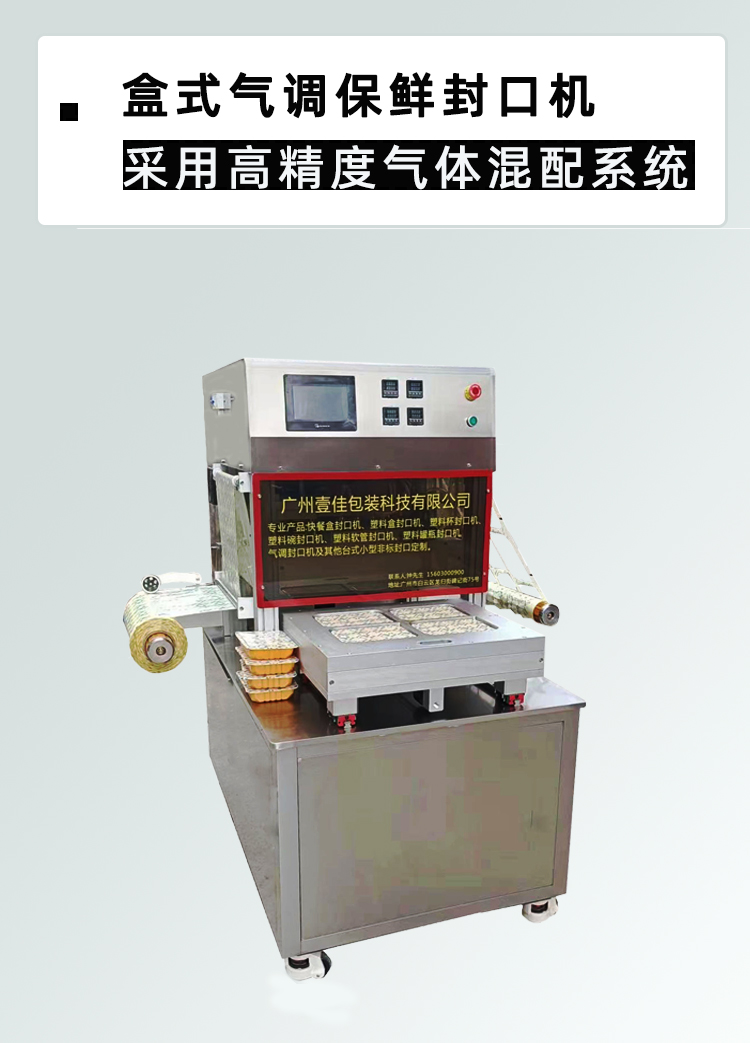 盒式氣調封口機,采用高精度氣體混配系統,可根據不同食品的保鮮需要,迅速轉換不同保鮮氣體的種類與混合比例,使所包裝的食品長時間保持原有的風味和外觀,并在較大程度上抑制各種細菌與微生物的滋生,以達到客戶需求的保鮮效果。