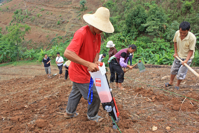 5、行距、間距:每一次的播種距離,以腳前掌及后跟距離為標準,一步一下,保持直線等距,增加出苗整齊率,確保高產優產。