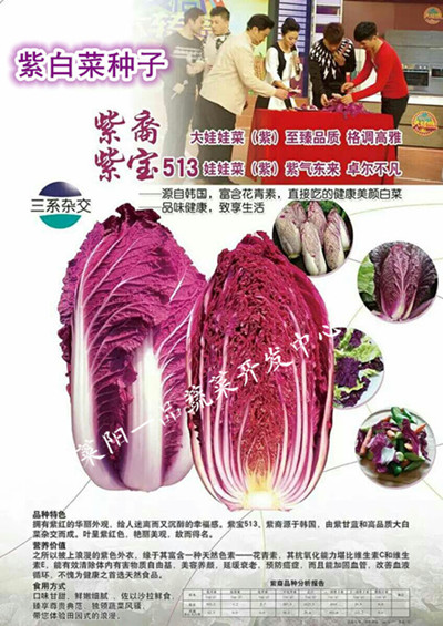 中熟、定植后68天左右可收獲!雜交紫色白菜種子,外葉紫色,內葉鮮紅紫色,球形直筒型,葉柄薄,干物質含量高,單球重1.5-2kg。青花素含量高,口感鮮嫩,商品性好。