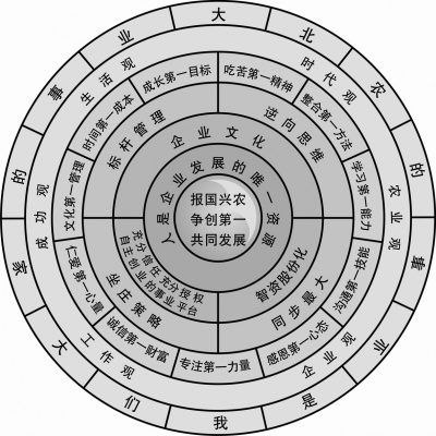 大北農的文化建設經歷了導入→形成系統→整理與修改→發揮作用→學習升級→自動自發等階段,由最初的物質文化、行為文化、制度文化上升為深層精神文化;從凌亂走向系統、專業。