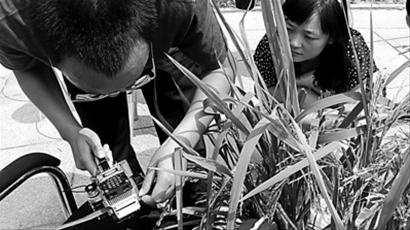 湖南省長沙市國家雜交水稻中心大院內,幾位科研人員在采集水稻光合作用的數據。