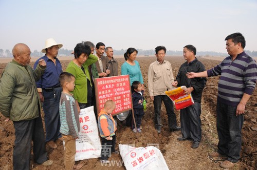 良種加配套良肥是提高糧食單產的根本途徑。示范方由農民提供連片土地,天脊集團供應化肥,河南農科院提供種子,縣高產攻關領導小組提供技術服務。采取統一免費供肥:在試驗田里為農戶免費供應天脊硝酸鱗甲每畝地五十公斤,并進行測土配方科學施肥;統一供應良種:河南省農科院提供培育的小麥花培八號等良種;統一機耕機播:縣高產攻關領導小組為實驗田引進大型旋耕機,播種機;統一種植模式:采取寬窄行精良播種;統一技術服務:邀請農業專家杜學云等從小麥施肥,選種,播種,管理等方面全程為農民提供服務。