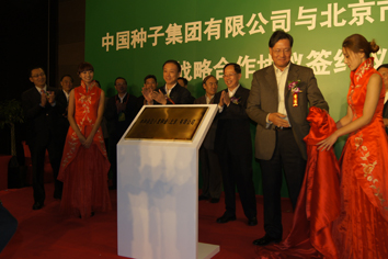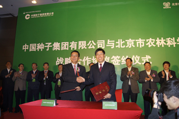 10月15日,中國種子集團有限公司與北京市農林科學院舉行戰略合作簽約儀式,雙方以資本為紐帶建立戰略合作伙伴關系,共同投資設立中種雜交小麥種業(北京)有限公司。農業部副部長危朝安、北京市委常委牛有成、中化集團副總裁韓根生,中國工程院院士劉旭、方智遠,中化集團總裁助理張偉、農業部種子管理局局長張延秋,農業部農技中心主任夏敬源、副主任鄧光聯,國資委改革局副局長劉文炳,北京市農委主任王孝東、副主任李成貴,北京市科委委員張紅,北京市農業局總農藝師鄭渝,北京市農林科學院黨委書記秦樹福、院長李云伏、副院長唐桂均出席了本次儀式。出席本次儀式的還有農業部、科技部、北(bei)京(jing)市、中國農(nong)科院、中化集團、北(bei)京(jing)市農(nong)科院等(deng)相關領導、專家及有關媒體(ti)。