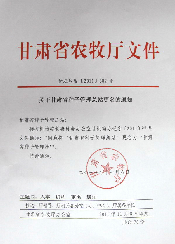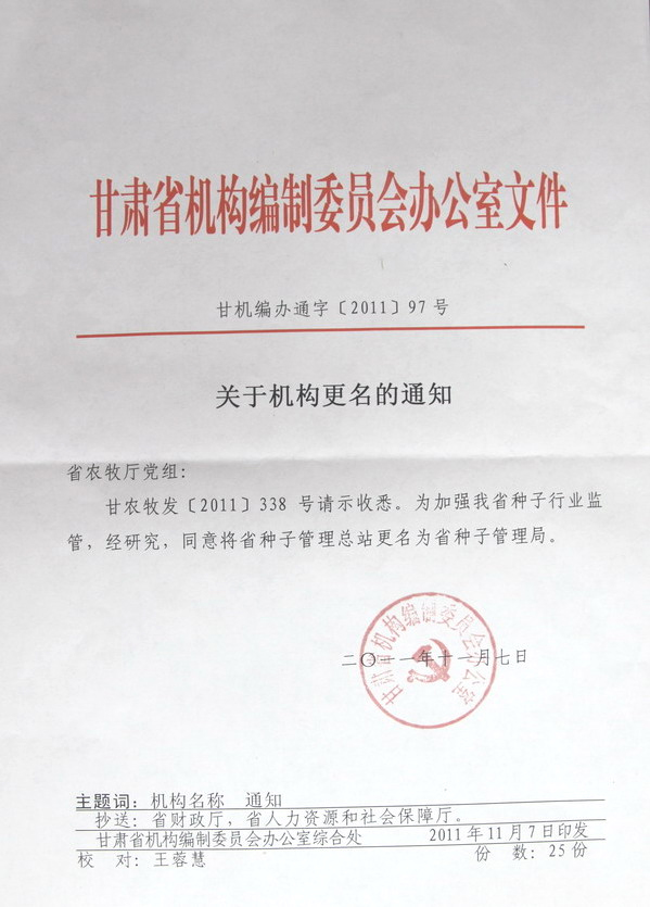 為了實現種子執法責任和職權的統一,進一步加強種子行業監管,推進我省由種業大省向種業強省的跨越,2011年11月7日,經省機構編制委員會辦公室批準,“甘肅省種子管理總站”正式更名為“甘肅省種子管理局”,這是我省加強種子管理工作的一項重大舉措,為完善種子管理機構建設,增強管理職能奠定了堅實的基礎,標志著我省種子行業監管工作邁上新臺階。