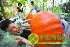 2010年9月2日,在江蘇省泰州市海陵現代農業科技示范園區,新采摘的巨型南瓜吸引了游人。南瓜直徑近1米,高0.6米,重180公斤,是通過航天育種培育成的新品種。