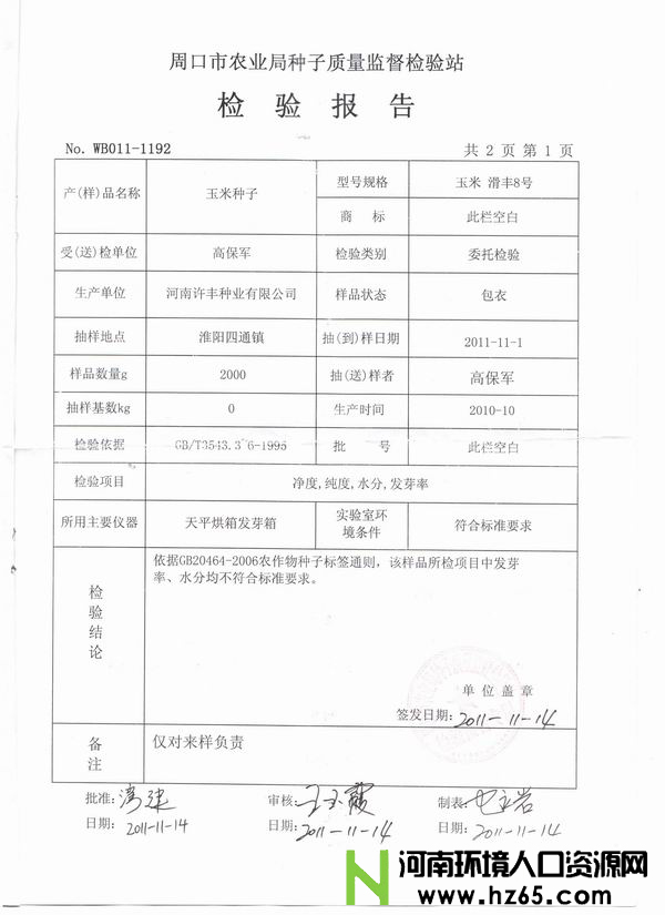 高保軍為了給當地農戶一個說法,他把剩下的河南許豐種業有限公司的種子送到了周口市農業局種子質量監督站進行檢測,最后得出結果為發芽率、水分均不符合標準要求。