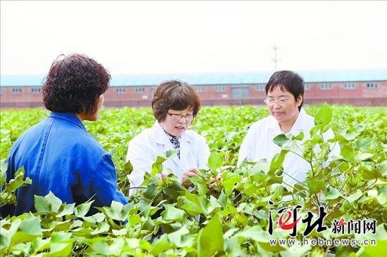 近日,張香云(中)和科研人員一起在棉花試驗田察(cha)看棉花長(chang)勢。 杜海英攝