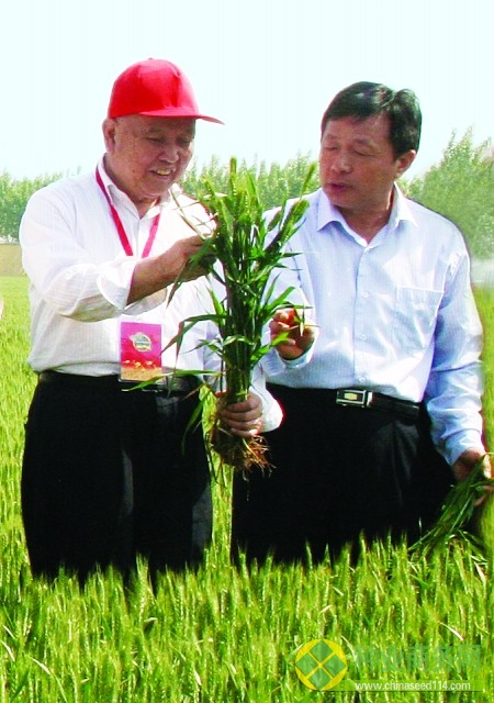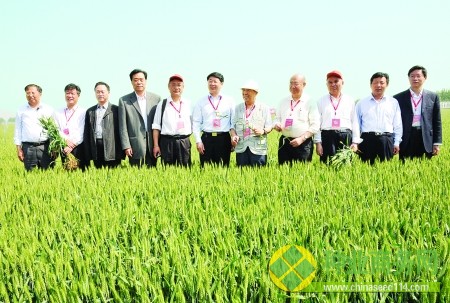 在2011年“百農矮抗58”高產觀摩會上,程順和院士(左七)、蓋鈞鎰院士(左八)、劉興土院士(左九)對“百農矮抗58”給予了高度評價