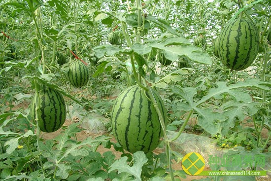 “金蘭無籽”為三倍體無籽西瓜,早熟中小果型品種。瓜氨酸含量達到2.5-3.2mg/g。全生育期90天左右,果實發育期30天。植株生長勢、分枝能力中等。坐瓜容易,畸形果少,商品率97.4%。果實圓球形,淺綠色果皮上顯墨綠色齒條,外形光滑、圓整、美觀,單果重2.4-3.0㎏。瓤檸檬黃色,質細而酥脆,中心糖度高,汁多且爽口,風味好,白秕子小、少,品質優。果皮厚度0.8㎝左右,耐儲運,抗病耐濕。主要優點:發芽率和成苗率高,果實外觀漂亮,易坐果,商品率高,產量高,耐儲運。栽培時省工省力,適合簡約化栽培。