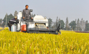 許躍進在收割機上對今年晚稻產量充滿憧憬。