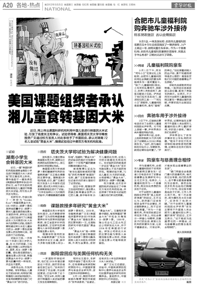 昨日公布的“黃金大米”事件調查情況通報稱,“黃金大米”試驗屬于湯光文主持的“兒童植物類胡蘿卜素維生素A當量研究”項目,項目內容是研究菠菜、“黃金大米”和β-胡蘿卜素膠囊中的類胡蘿卜素在兒童體內的吸收和轉化成維生素A的效率,探索預防兒童維生素A缺乏癥的途徑。2008年,該項目由浙江轉移至湖南,與蔭士安在湖南開展的國內項目“植物中類胡蘿卜素在兒童體內轉化成為維生素A的效率研究”合并進行,并確定衡南縣江口鎮中心小學為項目點。