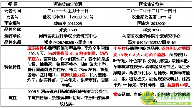 二○一二年十二月二十四日農業部公告第1877號公布了審定的農作物品種,筆者發現:河南省農業科學院小麥研究中心選育“鄭麥7698”,在國家審定及河南省審定公告的品種資料中,品種特征特性大相徑庭,令人大跌眼鏡。國家審定的“鄭麥7698” 為半冬性品種,成熟期比對照周麥18晚0.3天,幼苗半葡匐,抗倒性中等。而河南省審定的“鄭麥7698” 屬弱春性,生育期與對照偃展4110熟期相同,幼苗半直立,抗倒伏能力強。同時,在國審“鄭麥7698”的抗病性描述中有這樣一句話:“慢條銹病,高感葉銹病、白粉病、紋枯病和赤霉病。”,讓筆者很難理解其中之意。