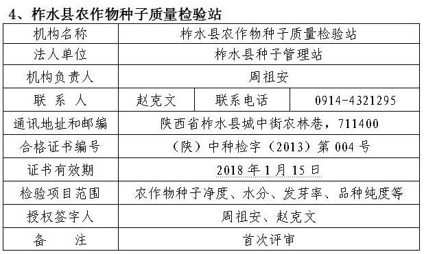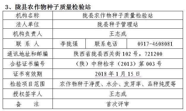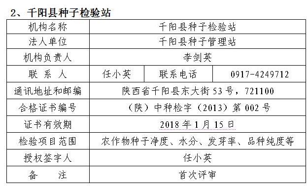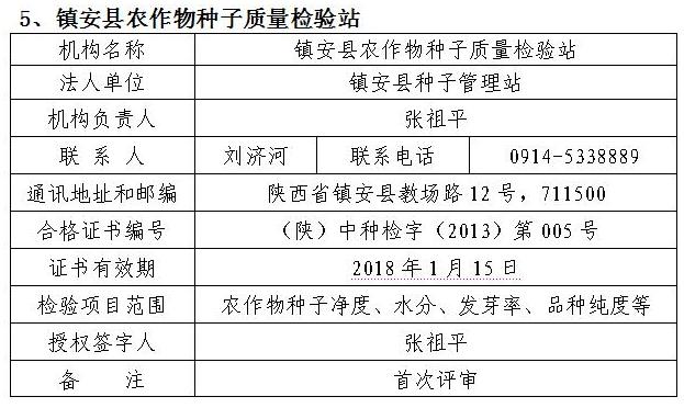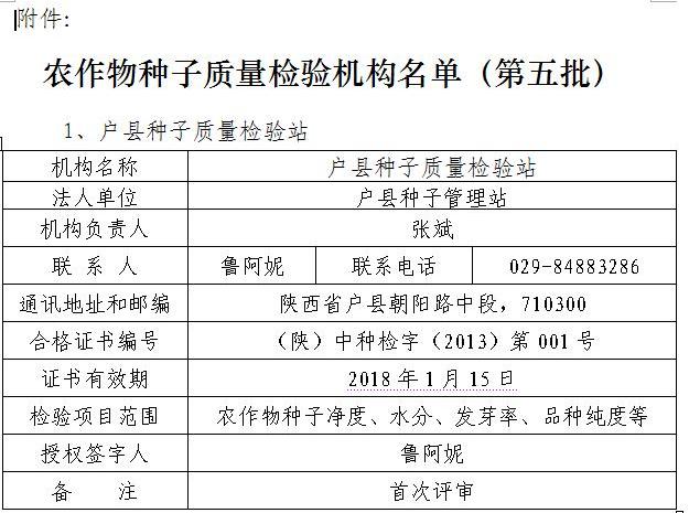 根據《中華人民共和國種子法》《農作物種子質量檢驗機構考核管理辦法》等有關規定,經我廳考核,戶縣種子質量檢驗站等5個農作物種子質量檢驗機構具備對外開展農作物種子檢驗的基本條件和能力,批準為合格種子檢驗機構,頒發《中華人民共和國農作物種子質量檢驗機構合格證書》,準許在批準的種子檢驗項目范圍內使用農作物種子質量檢驗機構合格標志。