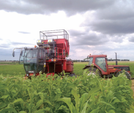 法國北部的Englbelmer,有一塊七八公頃的煙草地。圖為兩個農民相互合作收煙葉過程:左邊機器為已裝滿煙葉的煙草收割機,右邊為拉著拖車的拖拉機;收割機將煙葉卸到拖車上后繼續收割,拖拉機則將煙葉運往加工場所。一個來回約30分鐘,能處理約7立方米煙葉。