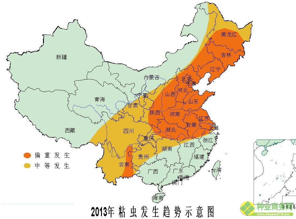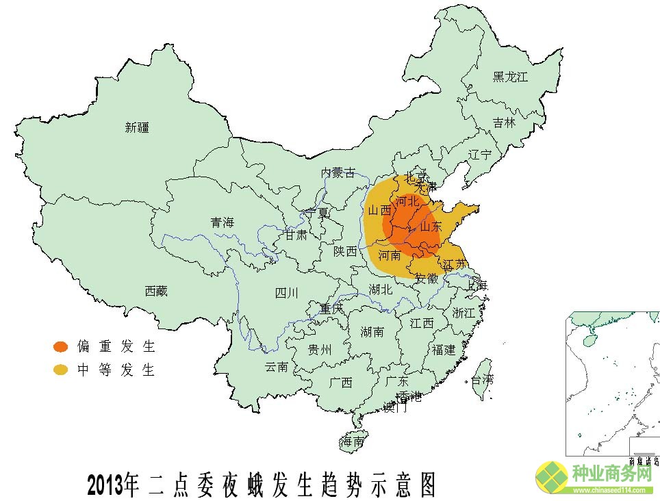 據國家氣候中心預測,2013年春季氣溫,黑龍江、吉林大部、內蒙古東部較常年同期偏低,全國其余大部地區氣溫接近常年同期或偏高;黑龍江東部、吉林大部、遼寧東部、山東大部、河南大部、湖北北部、安徽北部、江蘇北部降水較常年同期偏多,其中吉林東部降水偏多2~5成;全國其余大部地區降水較常年同期偏少。以上氣候條件將有利于東北和黃淮地區玉米螟的化蛹和羽化,也有利于一代粘蟲在江淮、黃淮麥區的發生危害。夏季,如遇降水偏多天氣,將有利于粘蟲、二點委夜蛾、大斑病、褐斑病等病蟲害發生危害;如降水少、氣溫高,則有利于蚜蟲、葉螨、雙斑螢葉甲、棉鈴蟲等害蟲的發生危害。