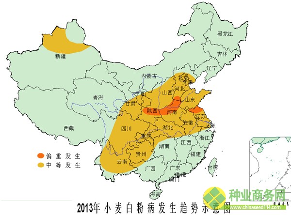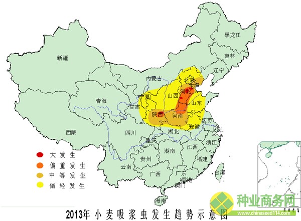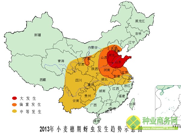 據全國農業技術推廣服務中心會同科研、教學和推廣單位專家分析預測,2013年小麥病蟲害總體偏重發生,發生程度略輕于2012年,預計發生面積10億畝次,病害4.6億畝次,蟲害5.4億畝次,全國約80%的冬小麥安全生產將受到威脅。其中,蚜蟲偏重至大發生,白粉病、紋枯病、條銹病、吸漿蟲和粘蟲在部分地區偏重發生,赤霉病在長江中下游和黃淮麥區流行風險較高。