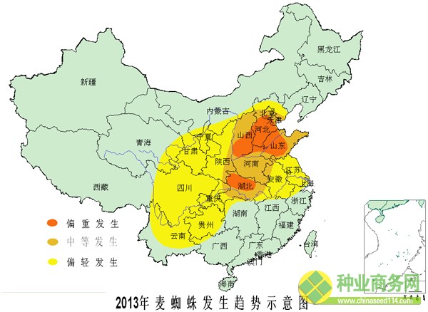 (二)蟲害。蚜蟲發生面積2.5億畝。其中,河北、山東大發生,華北、黃淮的其他麥區、江蘇和安徽沿淮和淮北、寧夏偏重發生,長江中下游、西南和西北大部麥區中等發生。小麥吸漿蟲發生面積4300萬畝。其中,河北邢臺、保定、廊坊和陜西咸陽、渭南的局部大發生,河北東南部、陜西關中中東部、河南北部偏重發生,以上3個省其他麥區和天津中等發生,北京、山西、安徽、寧夏偏輕發生,山東、甘肅等地輕發生。麥蜘蛛發生面積9200萬畝。其中,河北中南部、山東中部山區、山西南部、湖北北部偏重發生,河南大部、山東西南部、湖北西部中等發生,華北、黃淮的其他麥區,江淮、西南、西北麥區偏輕發生。一代粘蟲在江淮和黃淮南部麥區呈上升勢頭,發生面積超過1000萬畝。金針蟲、蠐螬、螻蛄等地下害蟲發生面積7000萬畝。其中,山西南部偏重發生,河南西部和南部、河北東南部、甘肅、寧夏中等發生,華北、黃淮、西北的其他麥區偏輕發生。此外,麥葉蜂、土蝗、灰飛虱、麥莖蜂等在部分麥區會有一定程度發生。