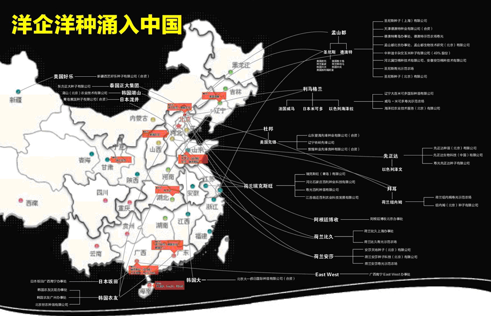 種業差不多算是外資最后進入的一個行業,但如果不是受外商投資政策限制,或許早已亮起了紅燈。從某位農戶使用上第一粒外資企業提供的種子開始,外資便快速涌入進來。據統計數據顯示,目前在我國共有35家跨國種子企業在農業部注冊,其中經營玉米的有5家企業,經營棉花的有2家,其余28家主營蔬菜和花卉,不少跨國公司在中國注冊成立分公司,或與國內種企共同投資成立合資公司。[詳細]