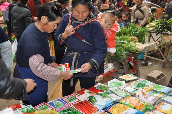 3月16日,貴州省榕江縣忠誠鎮的種子市場上,兩位侗族婦女正在選購水稻、玉米、蔬菜等良種。