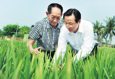 農業部部長韓長賦(右)在袁隆平院士陪同下,來到位于三亞的國家雜交水稻工程技術研究中心海南南繁基地,察看超級雜交稻第四期攻關的“種子選(xuan)手”。郭立(li)亮 攝
