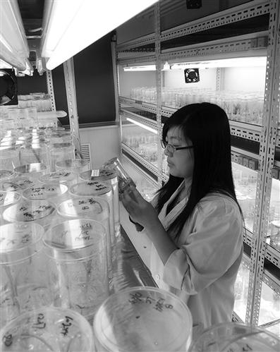 上圖 北京大北農科技集團股份有限公司加大研發投入,更新實驗設備,投入2.93億元研發資金到下屬北京金色農華種業科技有限公司。圖為大北農生物技術中心的科研人員在實驗室查看苗情長勢。