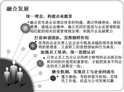 張琴:兼并重組不是簡單的疊加和拼湊兩個企業,更需要將雙方優秀的部分進行融合和升華,優勢互補,優缺相濟。融合首先是企業理念體系的構建,通過明確使命、規劃愿景、提煉企業精神、確立共同價值觀與企業管理職能相匹配的相關經營管理理念等,提升企業凝聚力。其次,榜樣的力量是無窮的,優秀的企業負責人既是卓越的領導者和精明的管理者,又是職工的思想領袖和行為典范,對打造和諧團隊意義重大。再次,加強員工培訓是統一思想認識的有效途徑。只有讓員工充分認識到樹立鮮明的企業新目標和共同的價值觀的重要性,才能把原來不同企業的員工凝聚到一起。