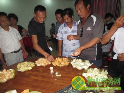 與會人員現場觀摩了縣瓜菜新品種展示示范基地的西甜瓜、番茄、彩椒和觀賞南瓜葫蘆等展示示范品種,并對6個甜瓜品種進行品嘗評價。經過現場考察評價,甜瓜品種:甬甜5號、小白龍、早生翠綠;番茄品種:石頭28、凱旋100、夏日陽光等獲得一致好評,同時觀賞南瓜葫蘆、彩椒系列也引起觀摩人員濃厚興趣。