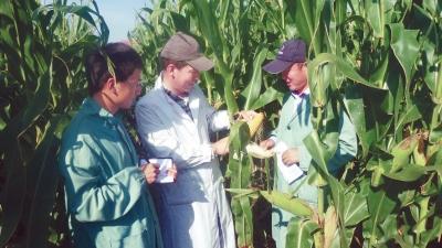圖為北京德農種業副總經理孫志勇博士(中)在內蒙古通遼試驗站與育種人員一起考察玉米品種比較試驗。