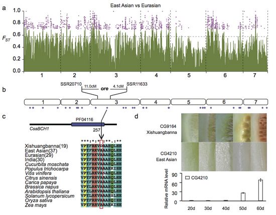 本研究創造性地運用了群體分化這一新分析算法,發現了1個西雙版納黃瓜特有的突變。該突變導致了編碼β-胡蘿卜素羥化酶的基因失效,從而使得西雙版納黃瓜在果實成熟期不能降解β-胡蘿卜素,使得西雙版納黃瓜具有特有的橙色果肉,而不是大部分黃瓜所呈現的白色或淺綠色果肉顏色。這一發現不僅為培育營養價值更高的黃瓜品種提供了分子育種工具,也為通過變異組快速挖掘重要性狀基因提供了新思路。(通訊員 李海芬)
