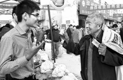 專程從鎮平縣侯集鎮姜營村趕來的農民張登三(右一)一下子購買了6000元的番茄、黃瓜、茄子種子,又被浙江神良種業有限公司生產的大花菜深深吸引。 本報記者楊遠高攝