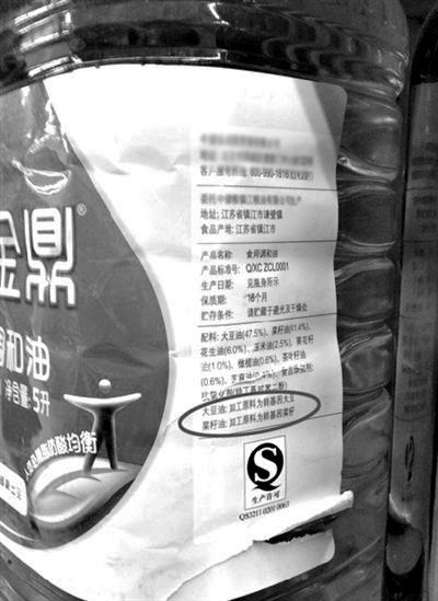 使(shi)用(yong)轉基因原(yuan)(yuan)(yuan)料(liao)(liao)的(de)(de)(de)(de)食用(yong)油(you)(you)的(de)(de)(de)(de)標(biao)識則(ze)隱蔽得多(duo)。在某品(pin)牌的(de)(de)(de)(de)一款(kuan)食用(yong)調(diao)和油(you)(you)上,“加工原(yuan)(yuan)(yuan)料(liao)(liao)為轉基因大豆”,“加工原(yuan)(yuan)(yuan)料(liao)(liao)為轉基因油(you)(you)菜籽”的(de)(de)(de)(de)字樣則(ze)“躲”在營(ying)養(yang)成分(fen)表上方以同樣大小的(de)(de)(de)(de)黑色字體顯(xian)示。而(er)在一款(kuan)1.8L裝某品(pin)牌玉米胚芽油(you)(you)上,記(ji)者則(ze)沒有(you)找(zhao)到是否使(shi)用(yong)轉基因原(yuan)(yuan)(yuan)料(liao)(liao)加工的(de)(de)(de)(de)標(biao)識說明。