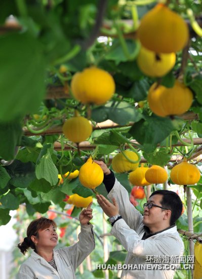 圖(tu)為技(ji)術人員觀察航天(tian)小金瓜(gua)長勢。記者 閆軍 攝