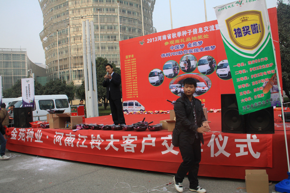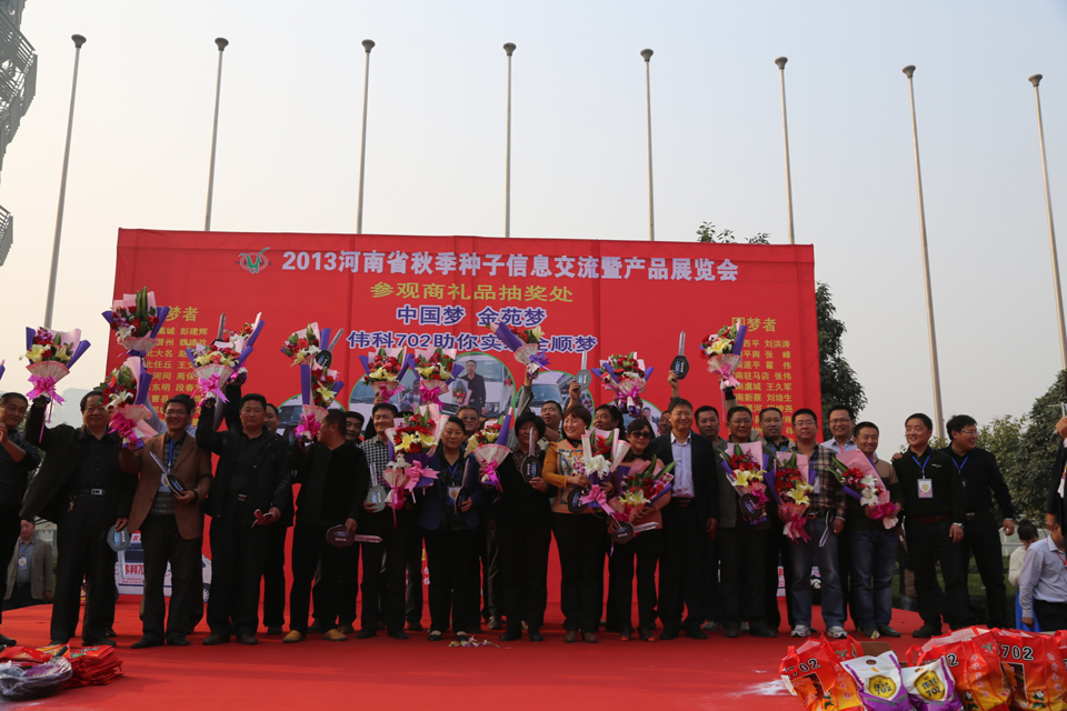 10月24日上午,2013河南省秋季種子信息交流暨產品展覽會在鄭州國際會展中心開幕。偉科702是本次會議的最熱門品種,也是繁育推廣面積增長最快的玉米新(xin)品種(zhong)(zhong)(河南省種(zhong)(zhong)子管理站站長毛景英(ying)在種(zhong)(zhong)子信息發布(bu)會(hui)上報告中明確(que)指出)。偉科702選育推廣單位金(jin)苑(yuan)種(zhong)(zhong)業斥資600萬元開展的(de)“國經(jing)銷商頒獎(jiang)儀式”會(hui)議(yi)推向高潮(chao)。42名來自河南、河北、山東、安徽等省份的(de)優秀經(jing)銷商通過與(yu)金(jin)苑(yuan)種(zhong)(zhong)業合作(zuo),共(gong)同推廣偉科702玉米種(zhong)(zhong)實現(xian)了(le)自己(ji)的(de)全(quan)順夢,喜獲福(fu)特、江鈴、全(quan)順汽車(每輛汽車價值15萬左(zuo)右)。