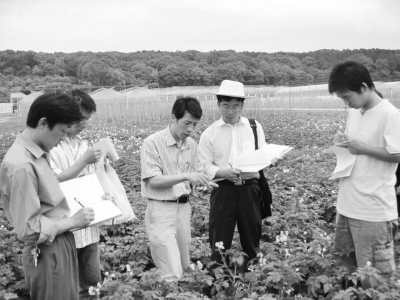 圖為謝從華(中(zhong))在做田間鑒定。