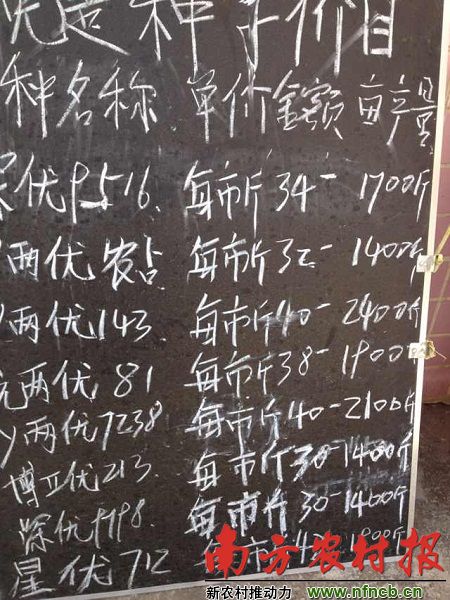 利用小黑板或紅紙宣傳當季銷售的品種是種子店多年的習慣,農戶也會根據上面的信息來選購稻種。然而,有些零售商卻在這里做文章——故意夸大品種信息來引誘農戶上鉤。