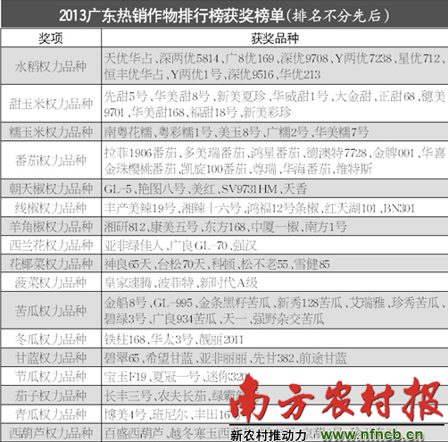 南方農村報訊 (記者惠婷婷)誰是2013廣東熱銷作物權力品種?誰是種植戶心中的心水品種?經過近一個月的人氣投票及專家審核后,2013廣東熱銷作物權力品種排行榜結果火熱出爐,最終93個品種突出重圍,獲得殊榮。此次活動從品種征集到投票評選,通過會議、報紙、雜志、網絡、微信、手機等多種渠道進行了廣泛宣傳。進入榜單的59家種企的222個品種均在2013年種子市場有售并在當地市場取得佳績,榜單力圖打造代表市場動向的權威平臺。