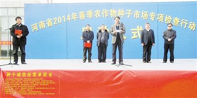 本報訊(記者 姬光環 文/圖)3月11日,河南省2014年春季農作物種子市場專項檢查行動啟動儀式在平原新區舉行,省農業廳副廳長魏蒙關,省種子管理站站長馬運糧,省農業廳種植業處副處長劉燦華,市農業局局長牛曉輝及種子管理人員和種子經營企業代表100多人參加了啟動儀式(如圖①)。