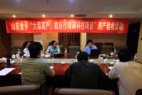 山東省濟寧市農委組織的測產專家組正在聽取中國農大胡樹文教授關于開展“大蒜高產、抗連作障礙科技項目”的介紹。