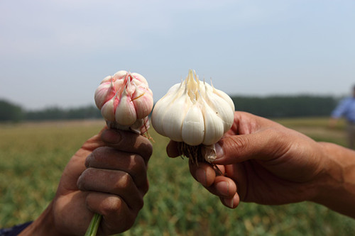 胡樹文教授手拿10株采用治理連作障礙綜合技術措施處理的大蒜,與蒜農張富貴手拿常規栽培的10株大蒜,形成鮮明的對比。