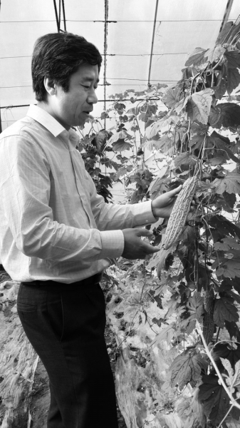 圖為天津科潤蔬菜研究所所長張斌在大棚內觀察苦瓜生長情況。資料圖