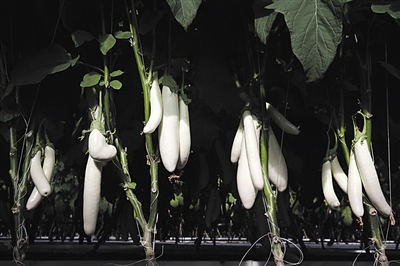 白玉茄子 茄類展示溫室里,色白如玉的茄子,頗為醒目。工作人員介紹,這種茄子產量高,口感綿軟,價格是普通茄子的兩倍還供不應求呢。