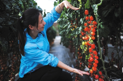 昨日,在豐臺區王佐鎮“世界種子大會品種展示基地”,女孩丈量一串番茄的長度。本版攝影/新京報記者 尹亞飛