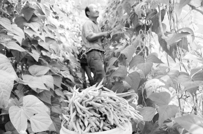 在新(xin)疆生產建(jian)設兵(bing)團第五師八(ba)十九(jiu)團農技人員的幫助下,該(gai)團農戶(hu)積(ji)極引進(jin)新(xin)品種(zhong)蔬菜致富。該(gai)團大(da)棚(peng)種(zhong)植戶(hu)丁(ding)宏(hong)偉(wei)(wei)種(zhong)植洋品種(zhong)“泰國架豆(dou)(dou)王”豆(dou)(dou)角兩棚(peng),畝產可達3500公斤。由(you)于其品質(zhi)好,成為市場上的搶(qiang)手貨,每(mei)公斤批發價格14元。圖為丁(ding)宏(hong)偉(wei)(wei)正(zheng)在采收種(zhong)植的“泰國架豆(dou)(dou)王”豆(dou)(dou)角。