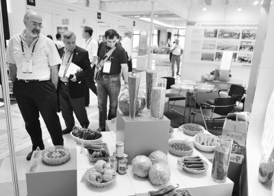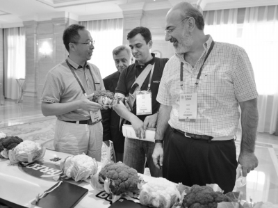 圖②一批具有自主知識產權的中國育種企業也參加了本屆世界種子大會。圖為外國客商在北京惠爾稼種業科技有限公司的展臺前了解花菜育種情況。