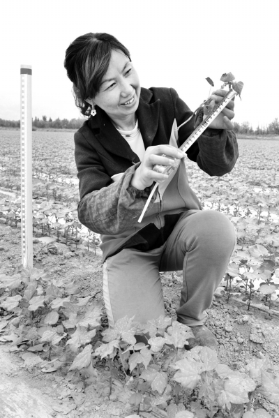 6月13日,新疆生產建設兵團第二師二十九團一名農科人員正對新品優良雜交棉生長進行監測。