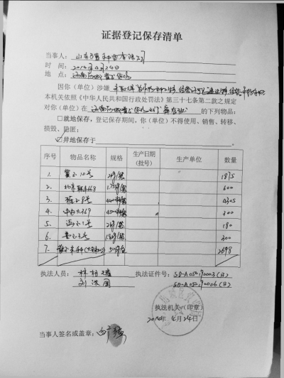 2014年4月24日,濟南市工商局聯合公安機關檢查了該公司的門市并控制住了正在進行(涉嫌違法)分裝生產的車間和倉庫現場,后農業部門趕來出具《證據登記保存清單》等法律文書并異地封存,見照片③、⑤。