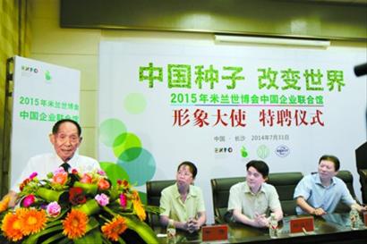 日前在湖南長沙國家雜交水稻工程技術研究中心,袁隆平接過“2015年米蘭世博會中國企業聯合館形象大使”特聘證書后發言。