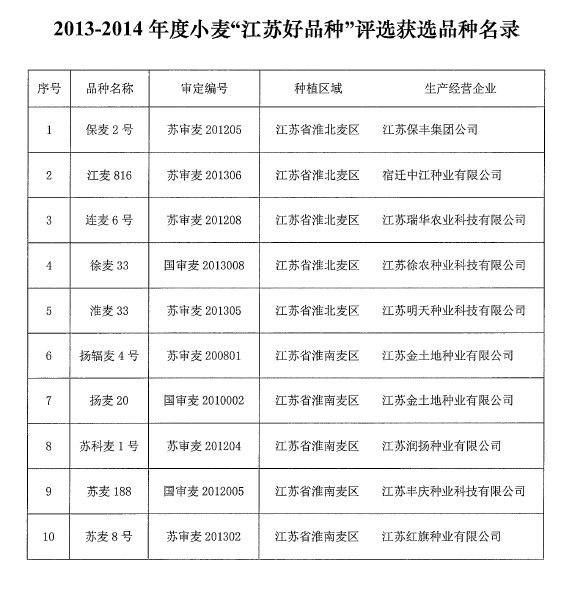 2013-2014年度小麥“江蘇好品種”評選活動經過農民投票、測產評比、行業專家打分,評審專家組綜合評定確認以及公示等程序后,最終評選出最受農民歡迎的“江蘇好品種”小麥品種10個,現將2013-2014年度小麥“江蘇好品種”評選活動評選結果予以公布。